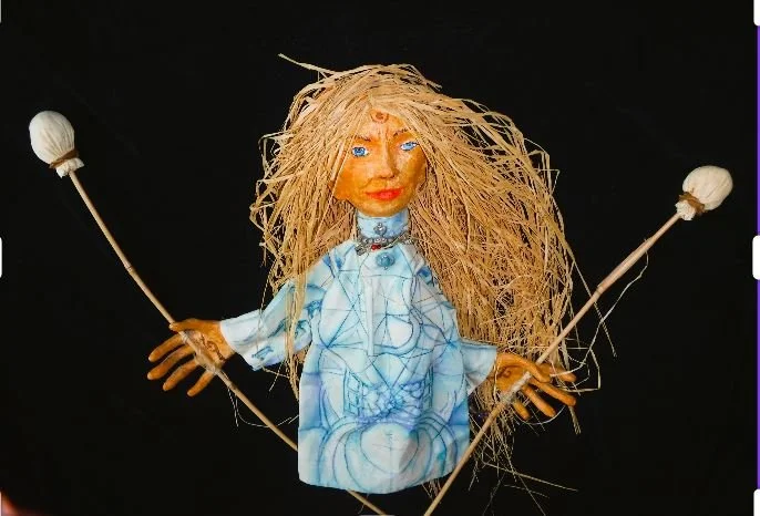 A woman with short hair, glasses, and a blue turtleneck sweater gesturing with her hands while sitting by a table with art supplies, near a window with hanging cloths.