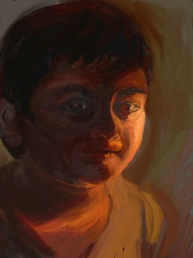 • A portrait of an open, receptive young woman with a pleasant smile and even, attentive gaze. The palette of the painting is a complementary blue and orange.